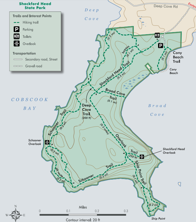 Shackford Head Trail (0.3 miles) This mostly flat trail begins at the kiosk in the parking lot and meets up with Broad Cove Trail, Deep Cove Trail, and Overlook Trail.